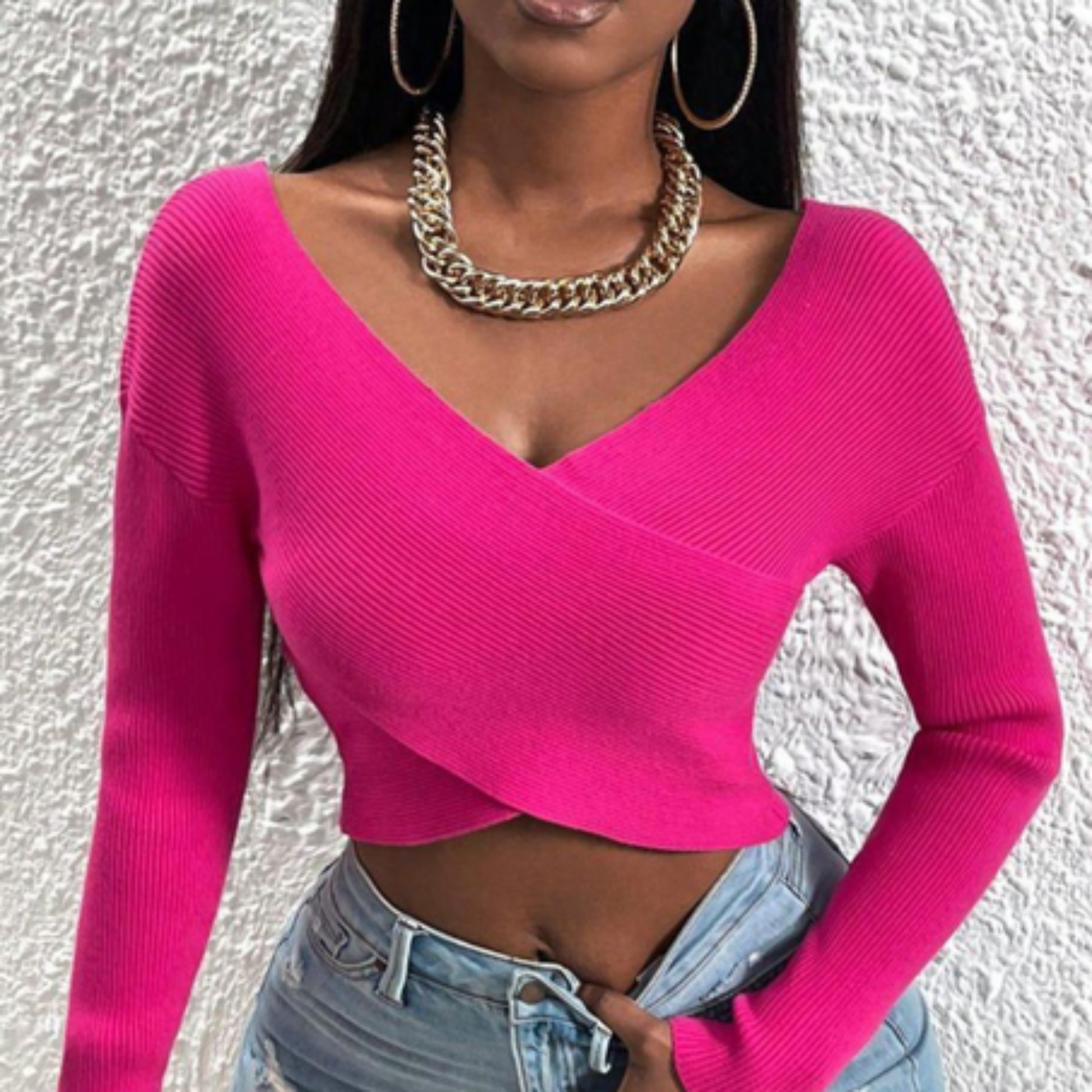 Embrassez l'audace avec ce pull rose court à col croisé, une pièce qui refuse de passer inaperçue. Son design croisé affirmé crée une silhouette flatteuse et moderne, tandis que la teinte rose vibrante capture l'attention. Parfait pour celles qui osent exprimer leur style avec confiance, ce pull transforme chaque tenue en déclaration de mode. Léger et intemporel, il s'adapte à vos envies du moment, du casual au sophistiqué.