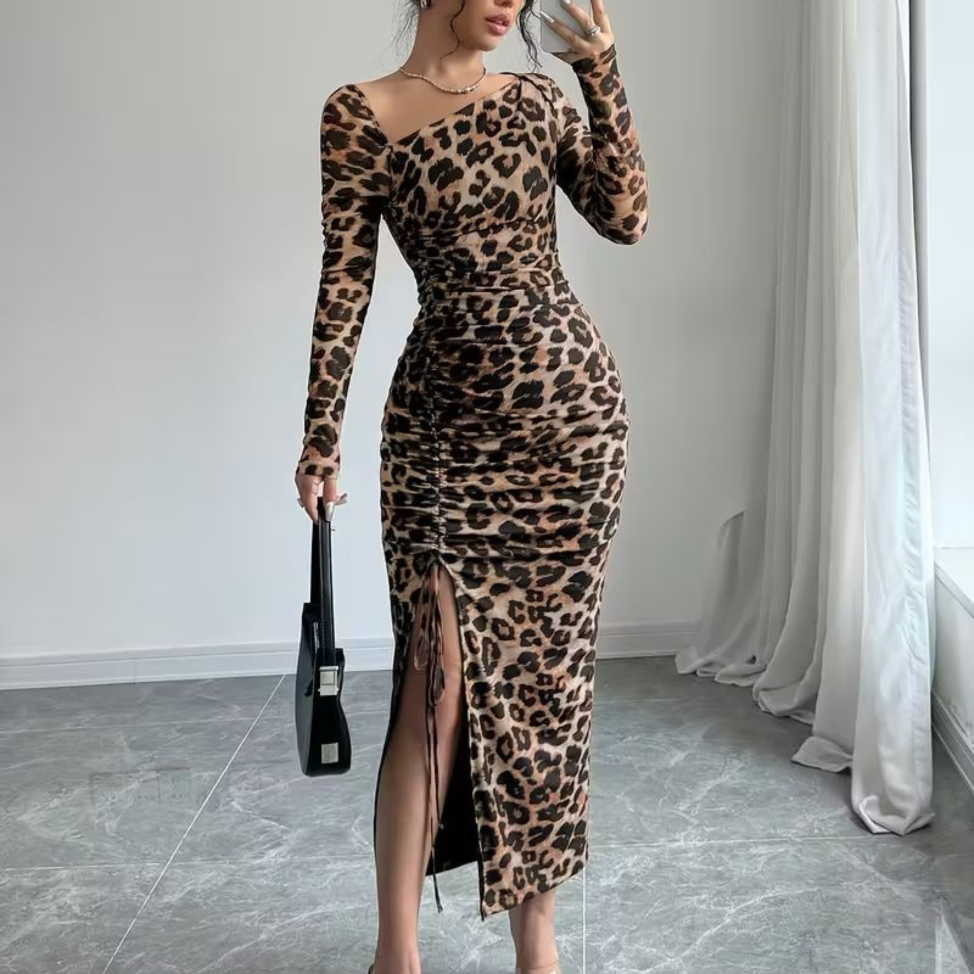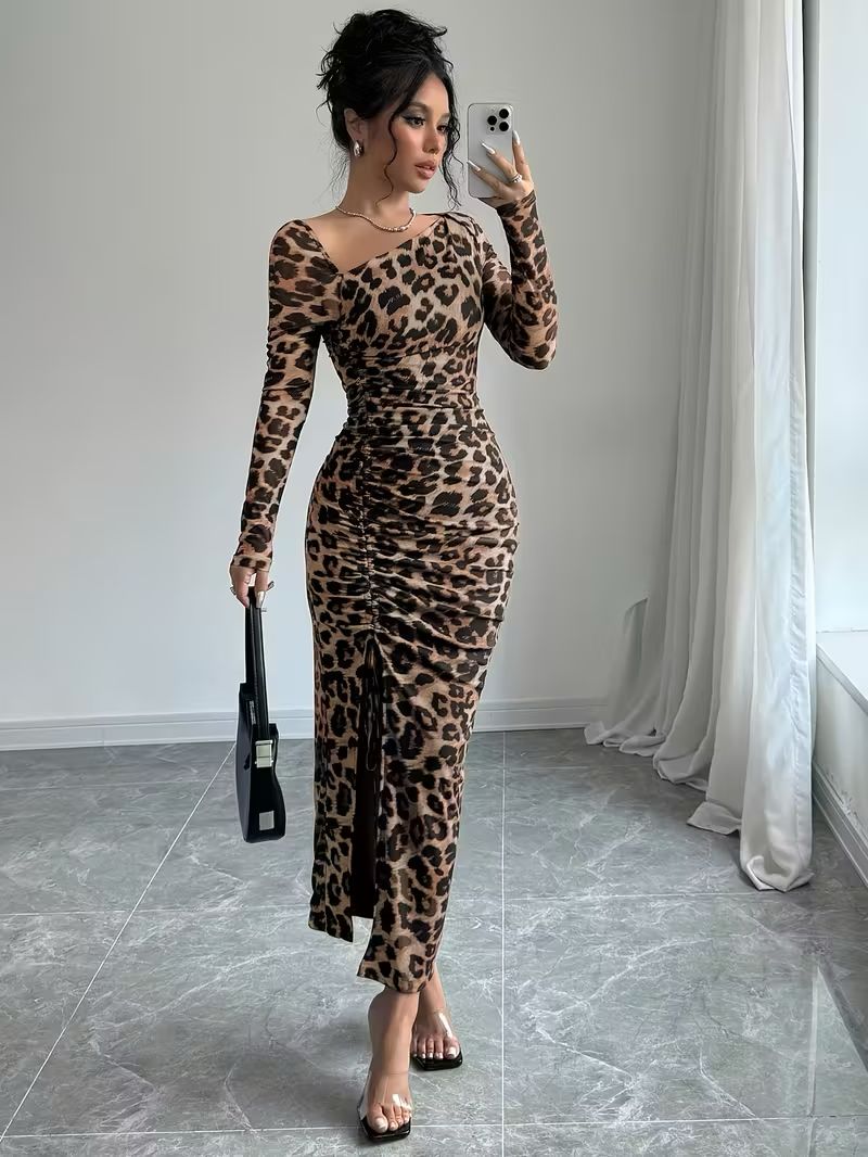 Incarnez l'audace avec cette robe longue qui fusionne élégance et caractère. Le motif léopard imprimé sur une maille fluide crée une silhouette captivante, tandis que le col asymétrique ajoute une touche de sophistication moderne. Les manches longues offrent une couverture élégante, parfaite pour les soirées où vous souhaitez vous démarquer. Une pièce incontournable pour celles qui osent affirmer leur style avec confiance et panache.
