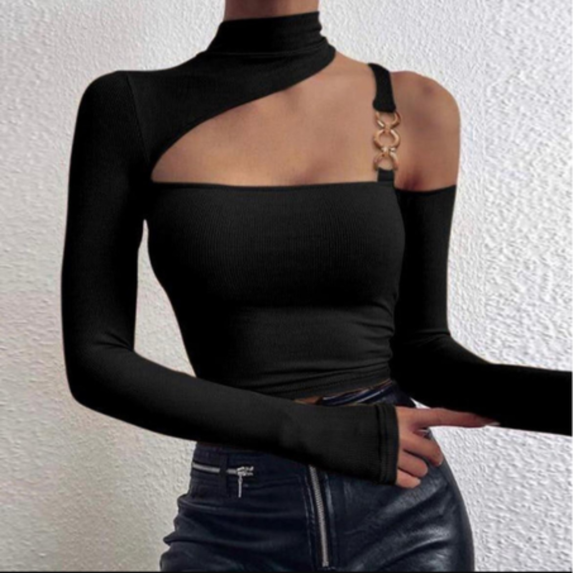 Embrassez l'audace avec ce top moulant qui joue les contrastes : des bretelles chaîne délicatement agressives encadrent vos épaules dénudées pour un effet captivant. La coupe ajustée épouse vos courbes avec assurance, tandis que les détails métalliques ajoutent une touche de rébellion sophistiquée. Parfait pour celles qui refusent de passer inaperçues et transforment chaque sortie en déclaration de style.